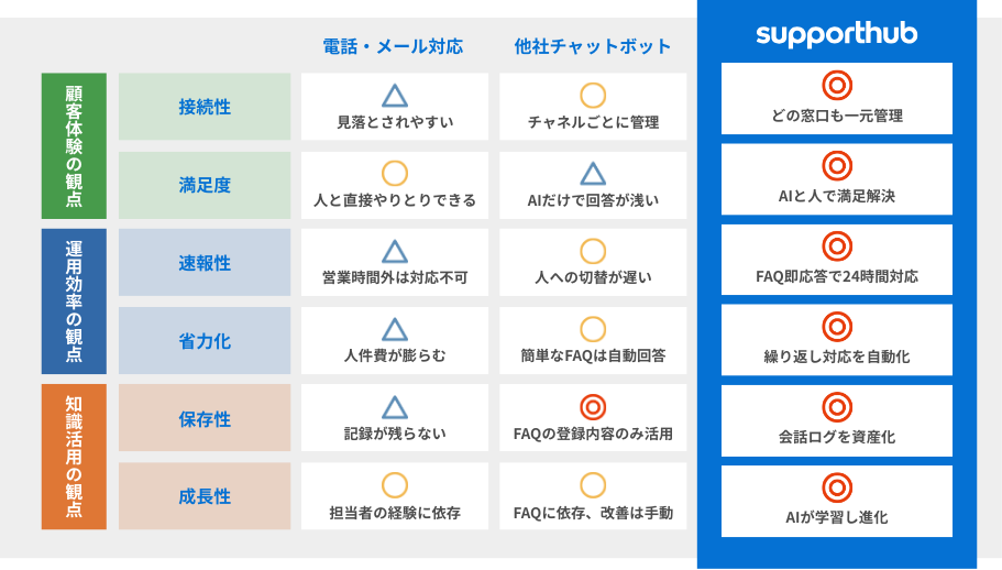 一般的なチャットボットはシナリオ通りにしか動けません。 SupportHubはAI×ナレッジで柔軟に回答し、必要に応じてオペレーターに引き継ぎ可能。 社外対応にも社内活用にも使えるのが特長です。