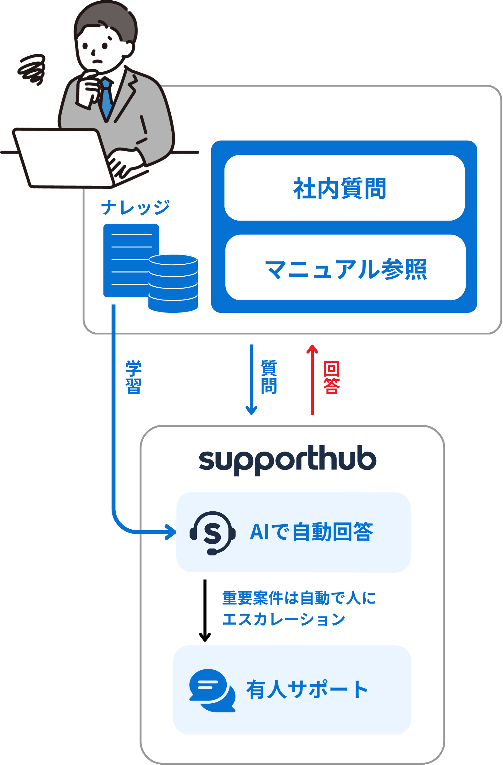 SupportHubなら、AIが社内マニュアル・ナレッジを参照し、新人からの質問に24時間自動回答。