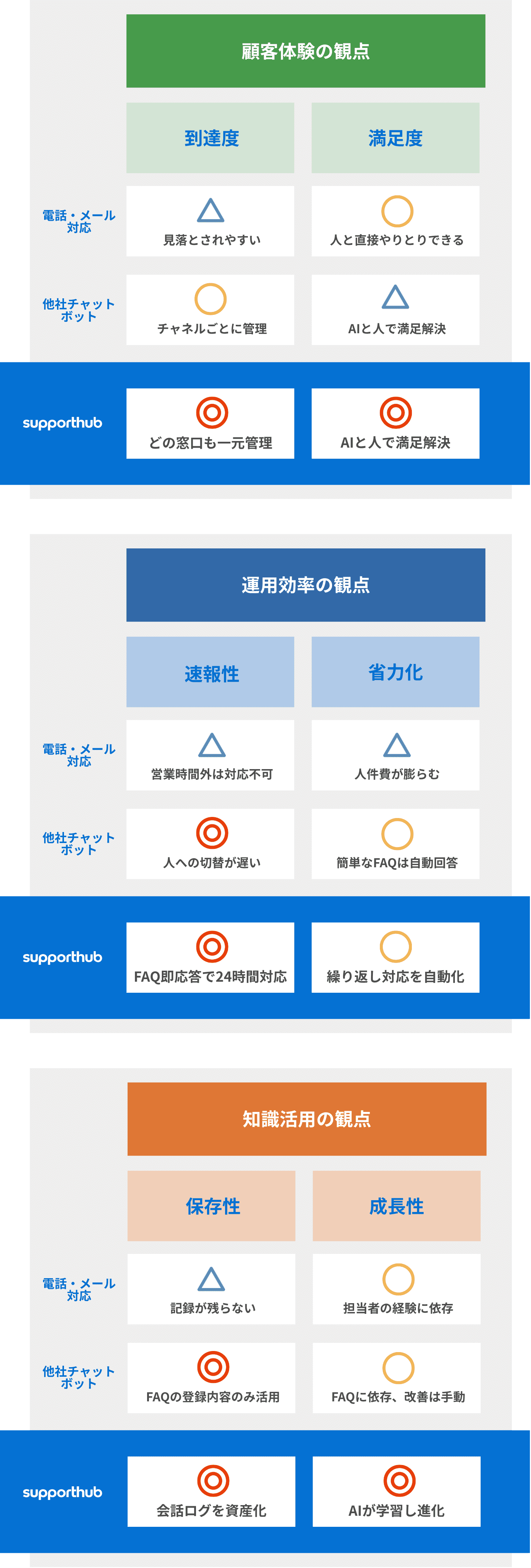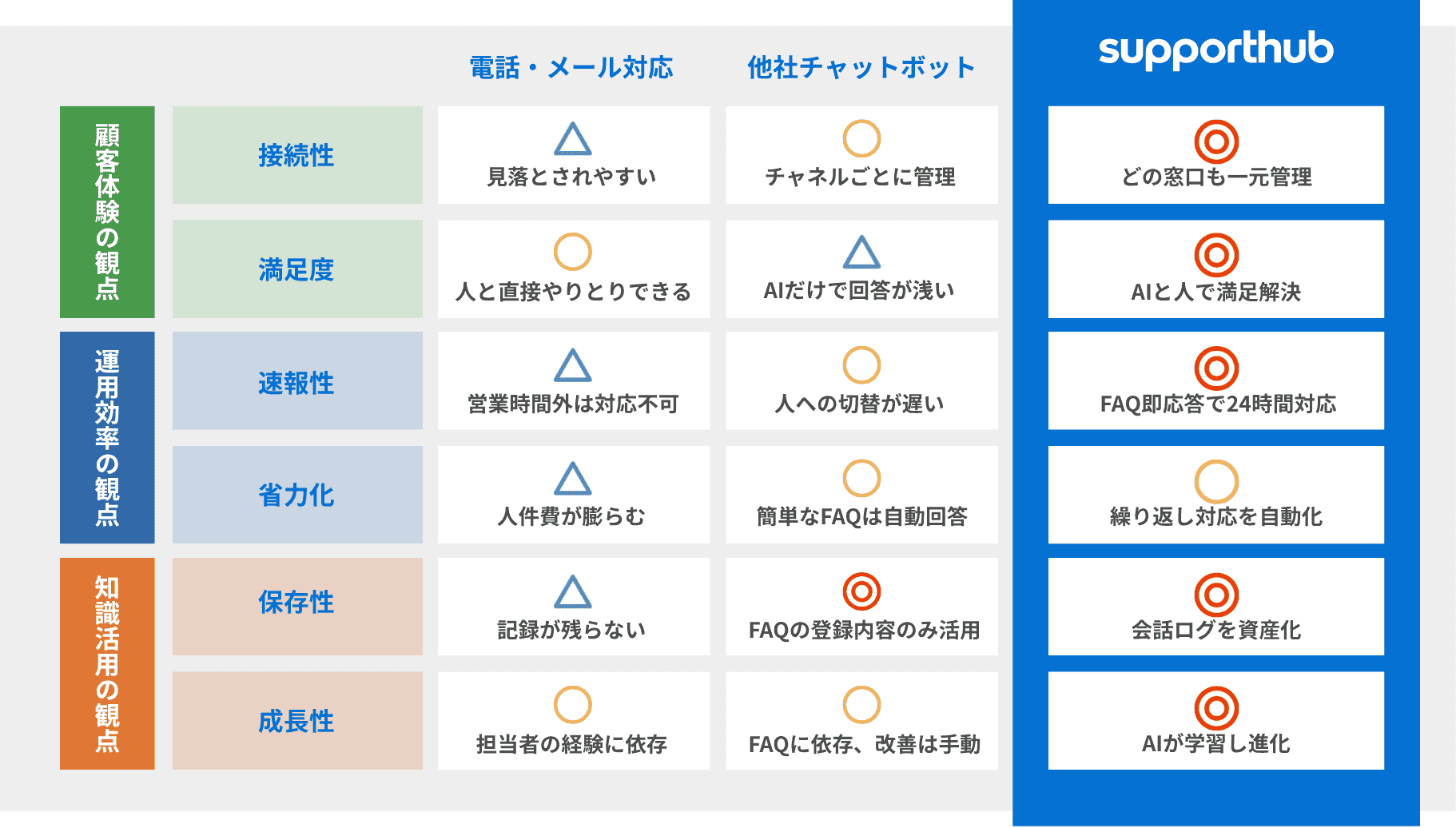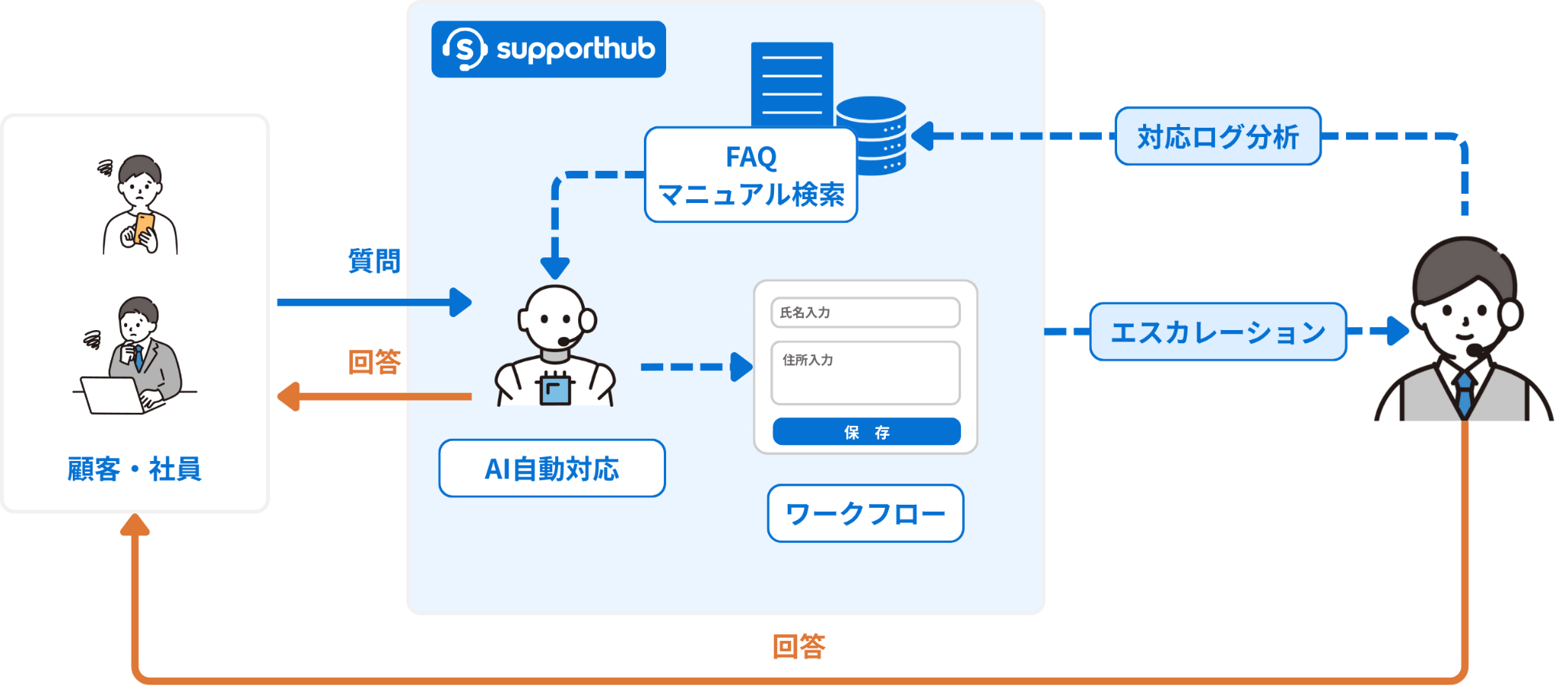一般的なチャットボットはシナリオ通りにしか動けません。 SupportHubはAI×ナレッジで柔軟に回答し、必要に応じてオペレーターに引き継ぎ可能。 社外対応にも社内活用にも使えるのが特長です。