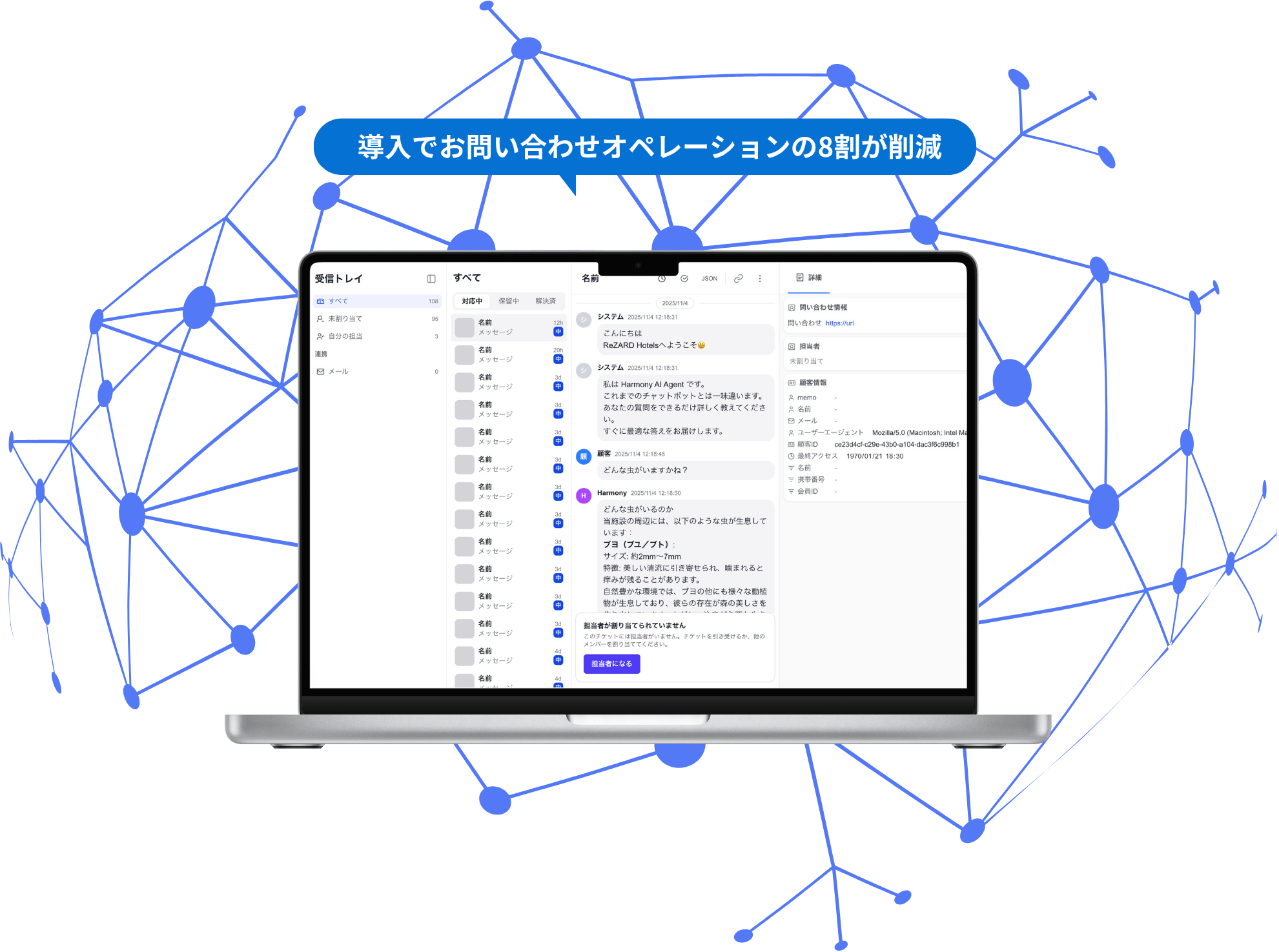 Harmony AIは、管理画面に搭載されたAIアシスタント。顧客情報など担当者の質問に対応し、業務効率と品質を向上させます。